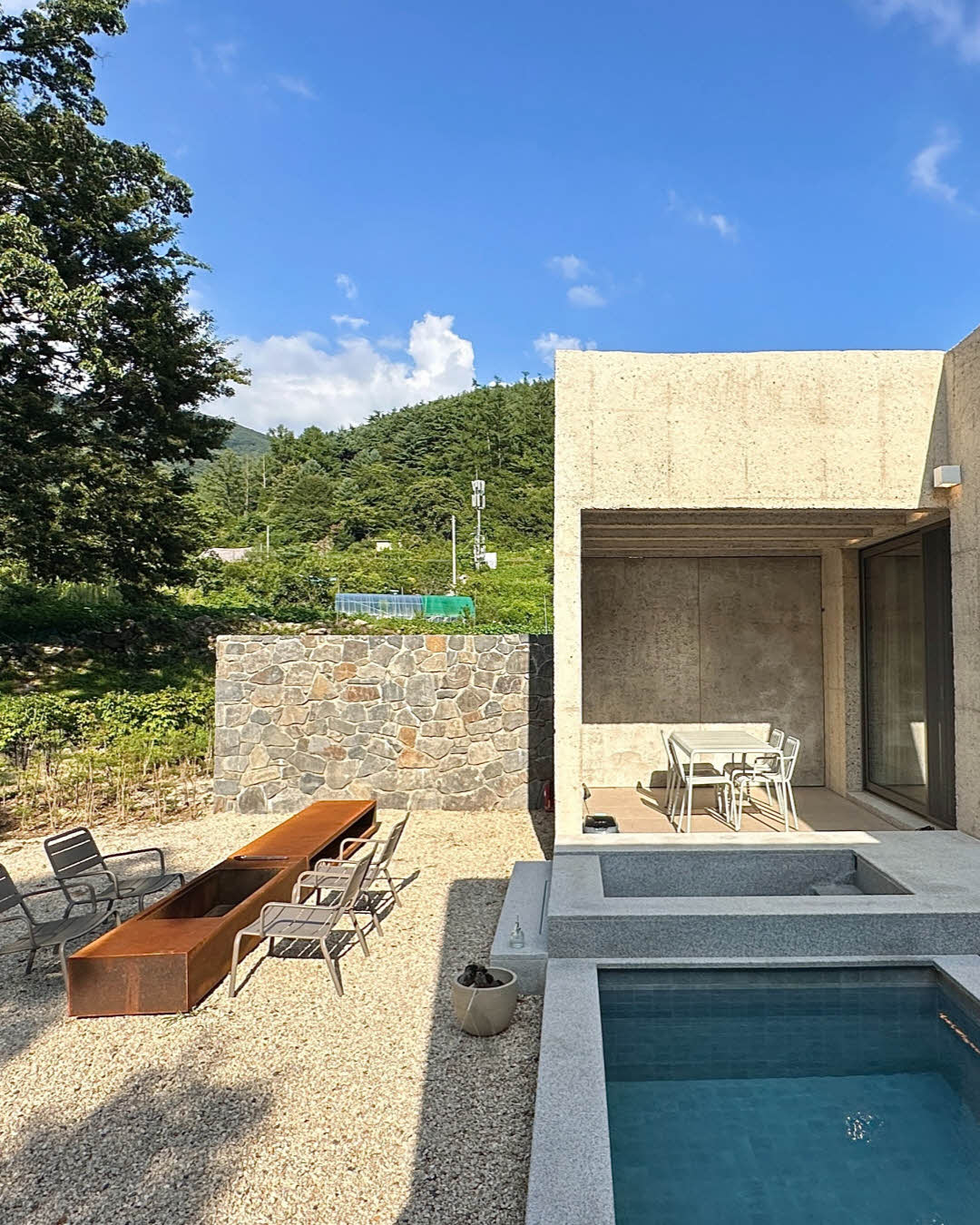 거실 겸 오픈 침실, 주방&다이닝, 중정, 세면실, 샤워실, 실내 욕탕, 화장실, 야외 테라스, 야외 수영장, 야외 자쿠지, 파이어핏 공간, 야외 정원