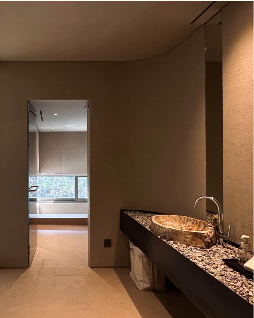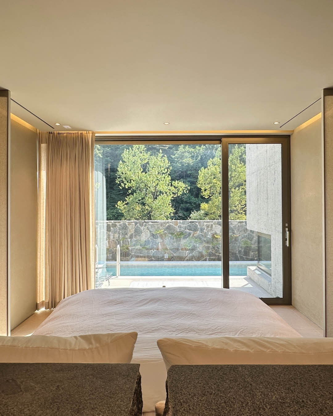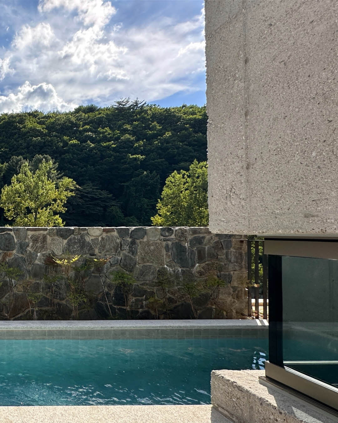 회전문은 공간을 자유롭게 연결하고, 창 너머 수영장과 자쿠지는 자연과 함께하는 사적인 휴식을 선사합니다.